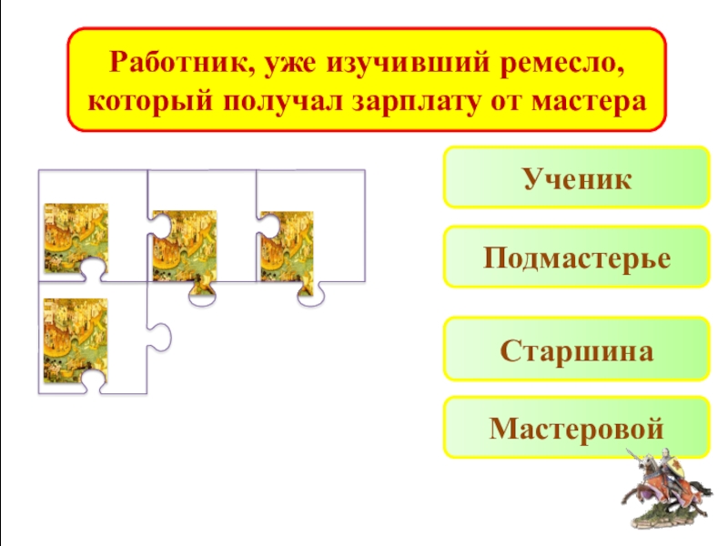 Работник, уже изучивший ремесло, который получал зарплату от мастераУченикСтаршинаПодмастерьеМастеровой
