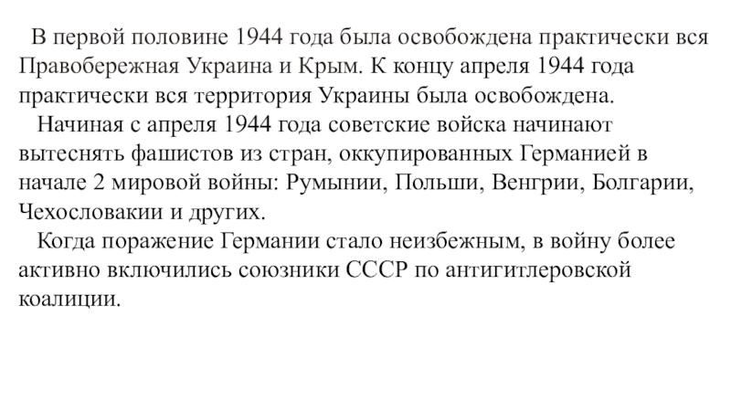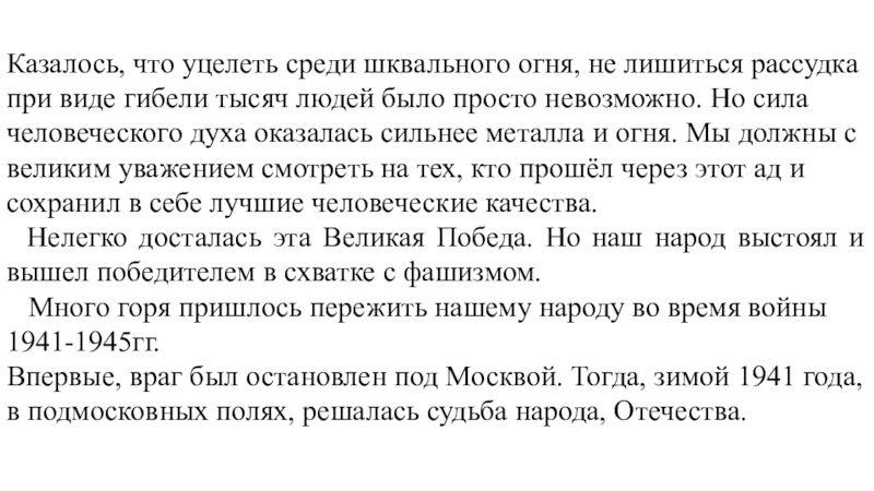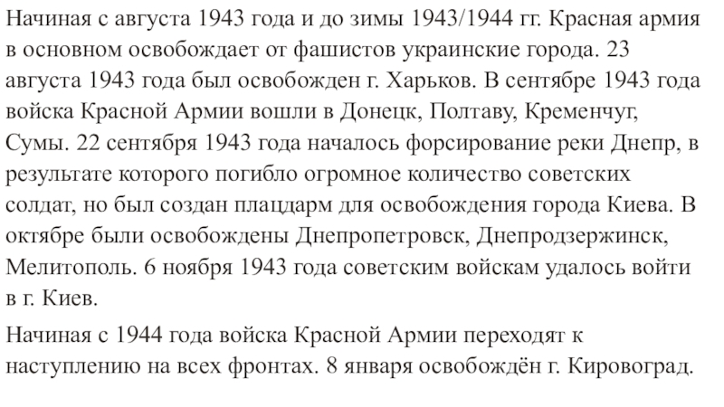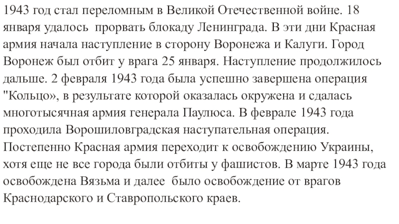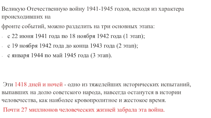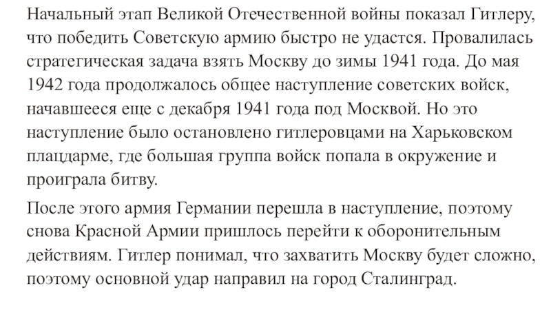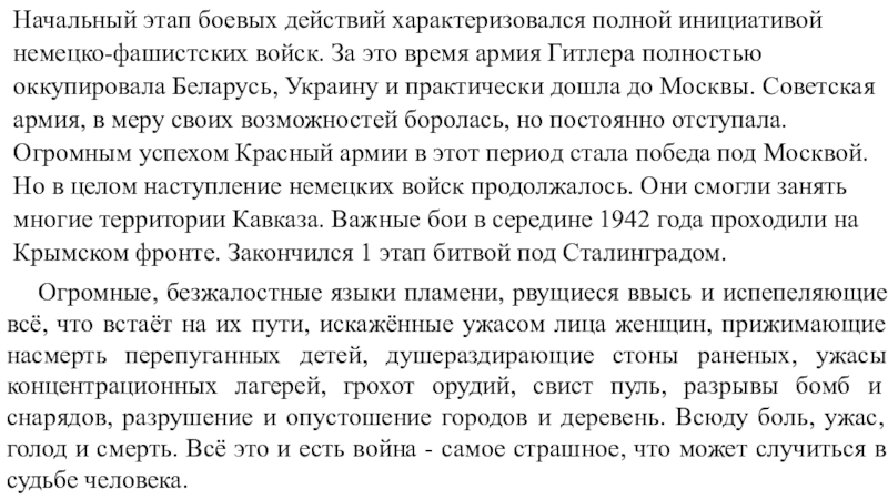 Начальный этап боевых действий характеризовался полной инициативой немецко-фашистских войск. За это время армия Гитлера полностью оккупировала Беларусь, Украину и практически дошла до Москвы. Советская армия, в меру своих возможностей боролась, но постоянно отступала. Огромным успехом Красный армии в этот период стала победа под Москвой. Но в целом наступление немецких войск продолжалось. Они смогли занять многие территории Кавказа. Важные бои в середине 1942 года проходили на Крымском фронте. Закончился 1 этап битвой под Сталинградом.