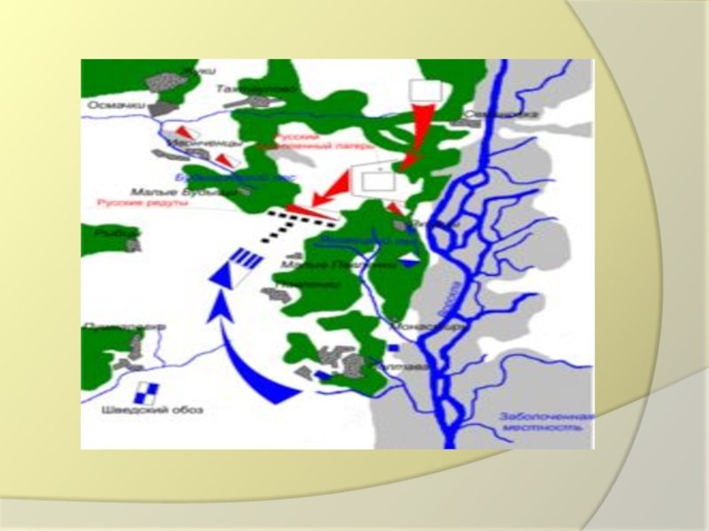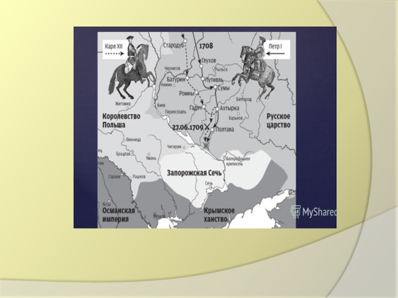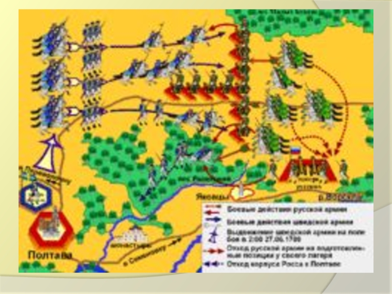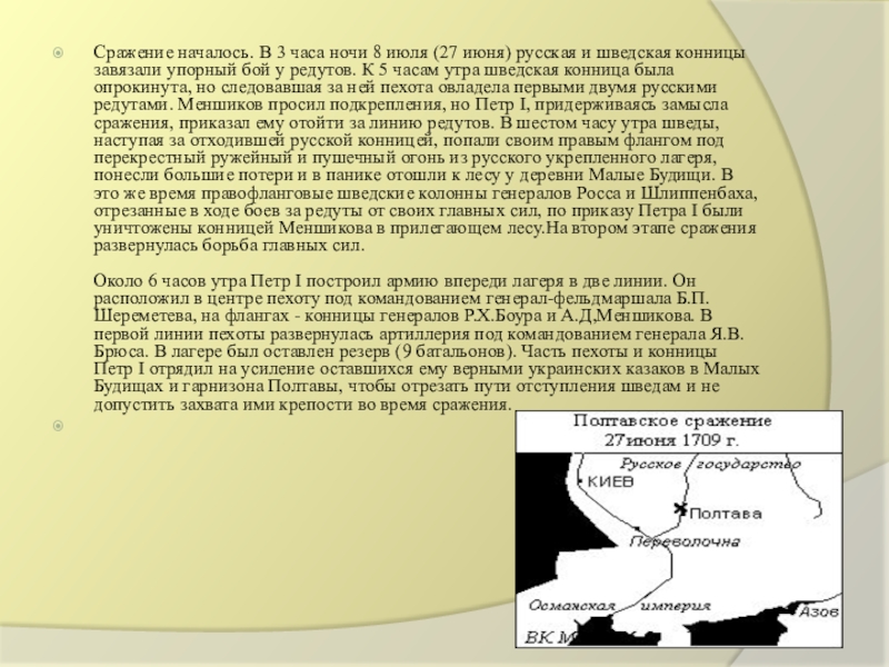 командованием Петра I и шведской армией Карла XII. Состоялась утром 27 июня (8 июля) 1709 года (28 июня по шведскому календарю) в 6 верстах от города Полтава на Украине (Левобережье Днепра). Разгром шведской армии...