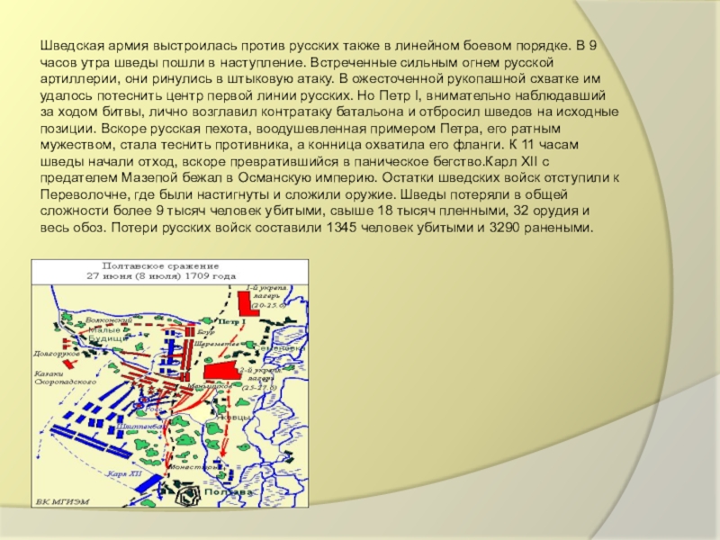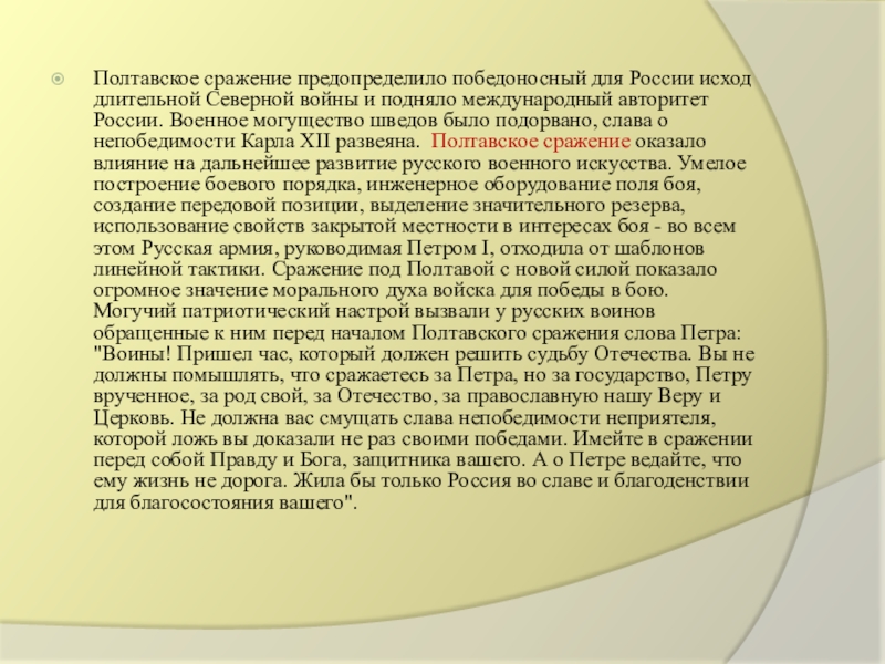 подняло международный авторитет России. Военное могущество шведов было подорвано, слава о непобедимости Карла ХII развеяна. Полтавское сражение оказало влияние на дальнейшее развитие русского военного искусства. Умелое построение боевого порядка, инженерное оборудование поля боя, создание передовой позиции, выделение значительного резерва, использование свойств закрытой местности в интересах боя - во всем этом Русская армия, руководимая Петром I, отходила от шаблонов линейной тактики. Сражение под Полтавой с новой силой показало огромное значение морального духа войска для победы в бою. Могучий патриотический настрой вызвали у русских воинов обращенные к ним перед началом Полтавского сражения слова Петра: "Воины! Пришел час, который должен решить судьбу Отечества. Вы не должны помышлять, что сражаетесь за Петра, но за государство, Петру врученное, за род свой, за Отечество, за православную нашу Веру и Церковь. Не должна вас смущать слава непобедимости неприятеля, которой ложь вы доказали не раз своими победами. Имейте в сражении перед собой Правду и Бога, защитника вашего. А о Петре ведайте, что ему жизнь не дорога. Жила бы только Россия во славе и благоденствии для благосостояния вашего".