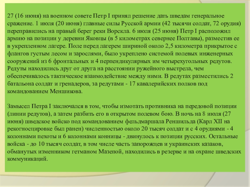 шведам генеральное сражение. 1 июля (20 июня) главные силы Русской армии (42 тысячи солдат, 72 орудия) переправились на правый берег реки Ворскла. 6 июля (25 июня) Петр I расположил армию на позиции у деревни Яковцы (в 5 километрах севернее Полтавы), разместив ее в укрепленном лагере. Поле перед лагерем шириной около 2,5 километра прикрытое с флангов густым лесом и зарослями, было укреплено системой полевых инженерных сооружений из 6 фронтальных и 4 перпендикулярных им четырехугольных редутов. Редуты находились друг от друга на расстоянии ружейного выстрела, чем обеспечивалось тактическое взаимодействие между ними. В редутах разместились 2 батальона солдат и гренадеров, за редутами - 17 кавалерийских полков под командованием Меншикова.