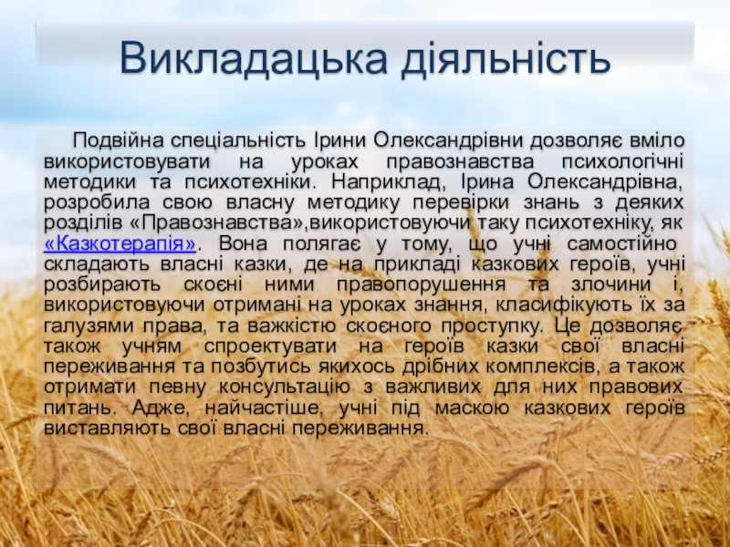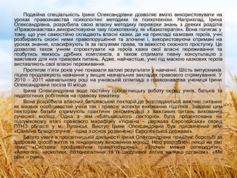 Слайд 4Подвійна спеціальність Ірини Олександрівни дозволяє вміло використовувати на уроках правознавства психологічні