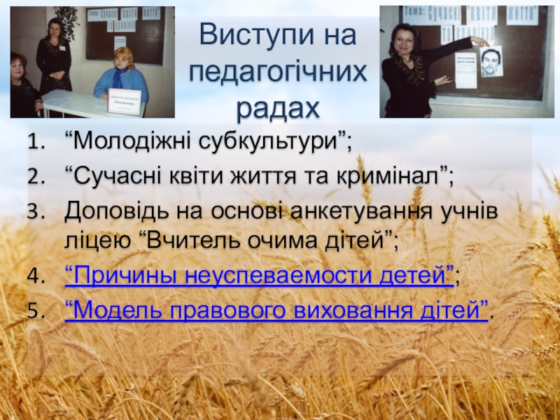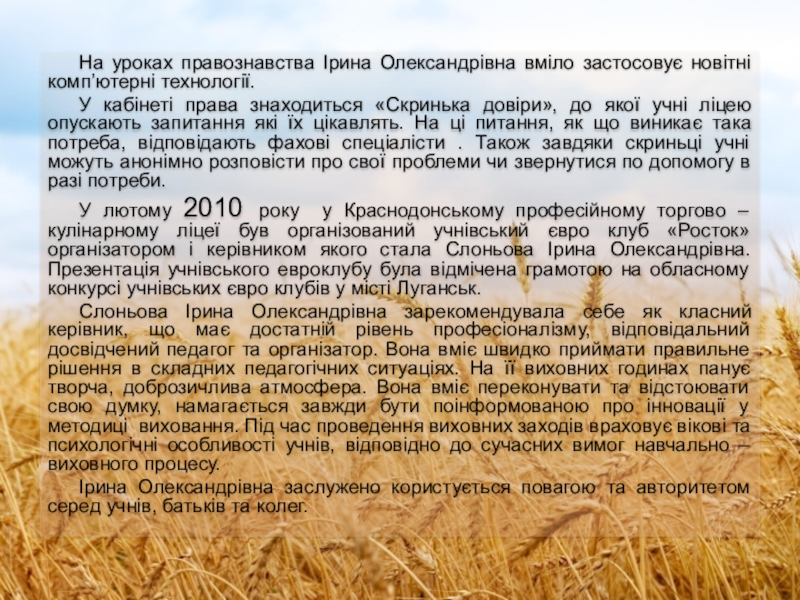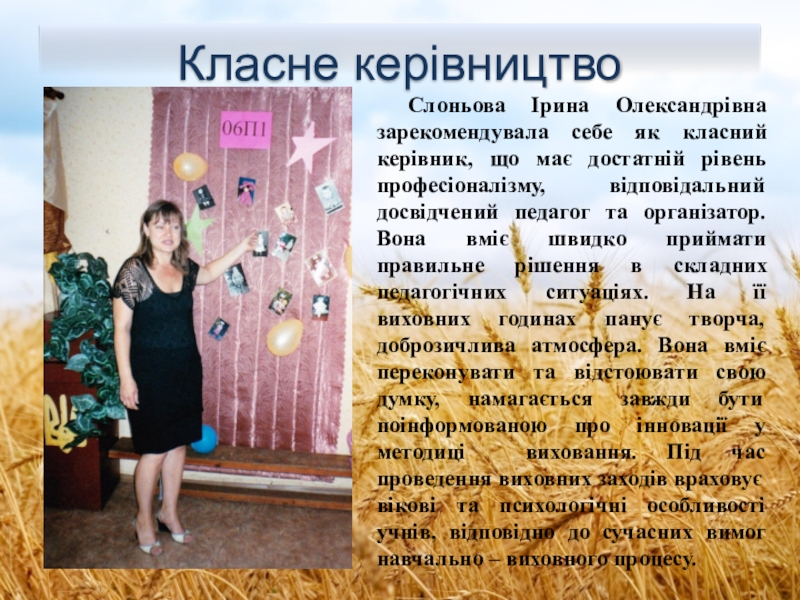 достатній рівень професіоналізму, відповідальний досвідчений педагог та організатор. Вона вміє швидко приймати правильне рішення в складних педагогічних ситуаціях. На її виховних годинах панує творча, доброзичлива атмосфера. Вона вміє переконувати та відстоювати свою думку, намагається завжди бути поінформованою про інновації у методиці виховання. Під час проведення виховних заходів враховує вікові та психологічні особливості учнів, відповідно до сучасних вимог навчально – виховного процесу.