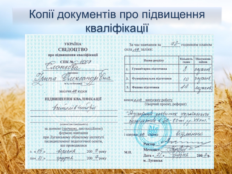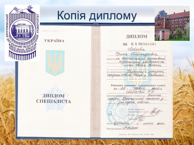 Закінчила у 2000 році. Присвоєна кваліфікація спеціаліста :