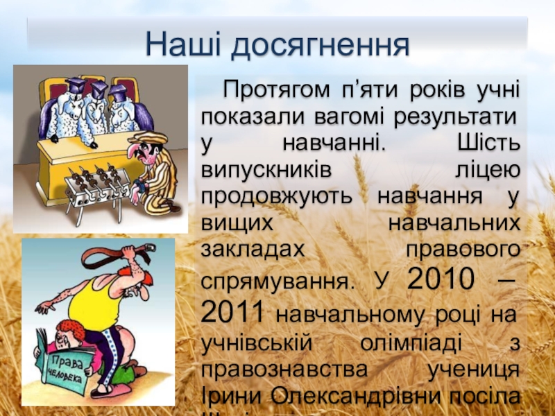 випускників ліцею продовжують навчання у вищих навчальних закладах правового спрямування. У 2010 – 2011 навчальному році на учнівській олімпіаді з правознавства учениця Ірини Олександрівни посіла ІІІ місце.