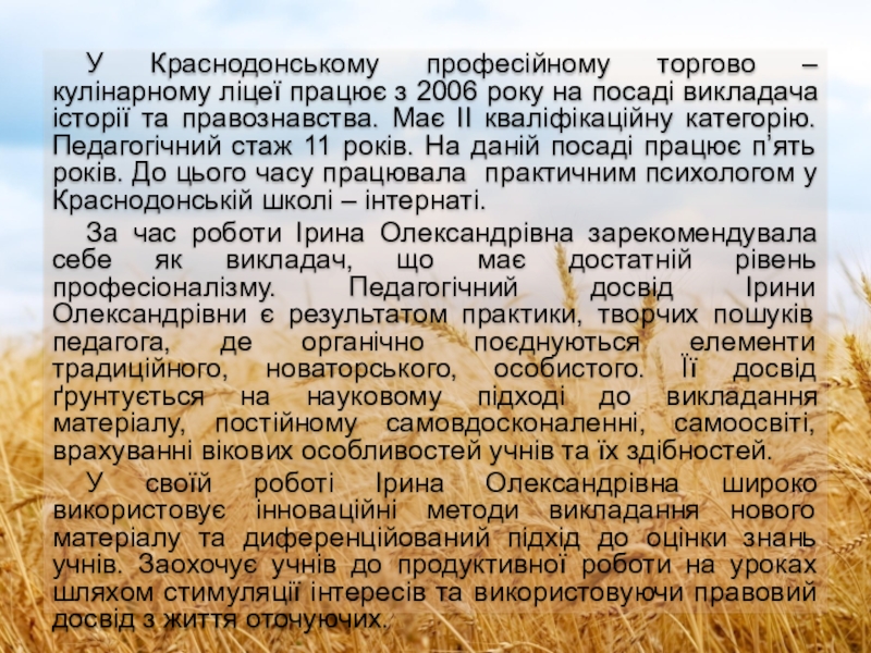 на посаді викладача історії та правознавства. Має ІІ кваліфікаційну категорію. Педагогічний стаж 11 років. На даній посаді працює п’ять років. До цього часу працювала практичним психологом у Краснодонській школі – інтернаті.