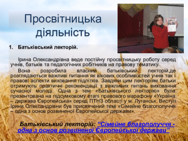 Ірина Олександрівна веде постійну просвітницьку роботу серед учнів, батьків та педагогічних робітників на правову тематику.