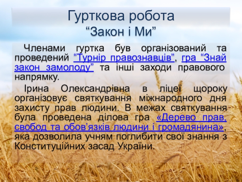 Демократизація суспільних відносин сприяє підвищенню активності особи, як суб’єкта цих відносин, а тому й вимогає глибокого розуміння нею процесів, що відбуваються в суспільстві, їх сутності, особливостей організації, функціонування та керування ними. Усе це зумовлює особливу актуальність вивчення державно правових явищ, які є одним з провідних засобів впорядкування відносин в суспільстві, і саме цим зумовлене заснування в ліцеї правового гуртка «Закон і ми», керівником якого вже на протязі п’яти років є Слоньова Ірина Олександрівна. Учні, які бажають поглибити свої знання у цьому напрямку, яким не байдужий розвиток України як демократичної правової держави у Європі, є членами цього гуртка. Під керівництвом Ірини Олександрівни вони займаються самостійною пошуковою роботою, проводять рейди «За здоровий спосіб життя». Результати своєї роботи вони публікують в ліцейній учнівській газеті «Міг». На організованих гуртком круглих столах розглядаються такі теми: «Ти гідно мусиш жити», «Суїцид – проблема самогубства серед молоді» та інші. Членами гуртка був організований і проведений серед учнів ліцею «Турнір правознавців», гра «Знай закон замолоду», «Казкова лотерея» та інші заходи правового спрямування. Ірина Олександрівна в ліцеї щороку організовує святкування міжнародного дня захисту прав людини. В межах святкування була проведена ділова гра «Дерево прав, свобод та обов’язків людини і громадянина», яка дозволила учням поглибити свої знання з Конституційних засад України.