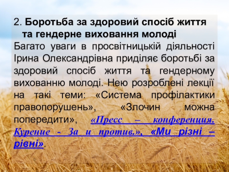 Слайд 162. Боротьба за здоровий спосіб життя та гендерне виховання молоді