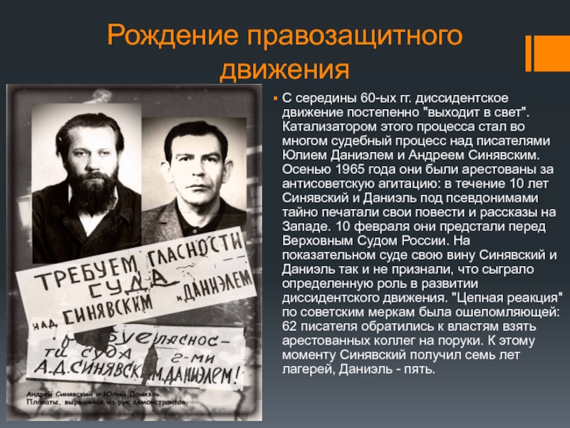 свет". Катализатором этого процесса стал во многом судебный процесс над писателями Юлием Даниэлем и Андреем Синявским. Осенью 1965 года они были арестованы за антисоветскую агитацию: в течение 10 лет Синявский и Даниэль под псевдонимами тайно печатали свои повести и рассказы на Западе. 10 февраля они предстали перед Верховным Судом России. На показательном суде свою вину Синявский и Даниэль так и не признали, что сыграло определенную роль в развитии диссидентского движения. "Цепная реакция" по советским меркам была ошеломляющей: 62 писателя обратились к властям взять арестованных коллег на поруки. К этому моменту Синявский получил семь лет лагерей, Даниэль - пять.