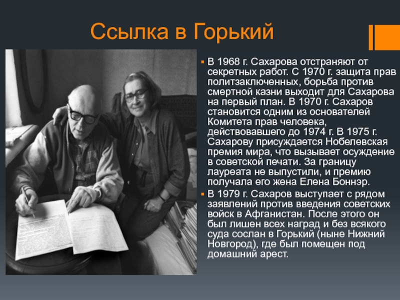 1970 г. защита прав политзаключенных, борьба против смертной казни выходит для Сахарова на первый план. В 1970 г. Сахаров становится одним из основателей Комитета прав человека, действовавшего до 1974 г. В 1975 г. Сахарову присуждается Нобелевская премия мира, что вызывает осуждение в советской печати. За границу лауреата не выпустили, и премию получала его жена Елена Боннэр.