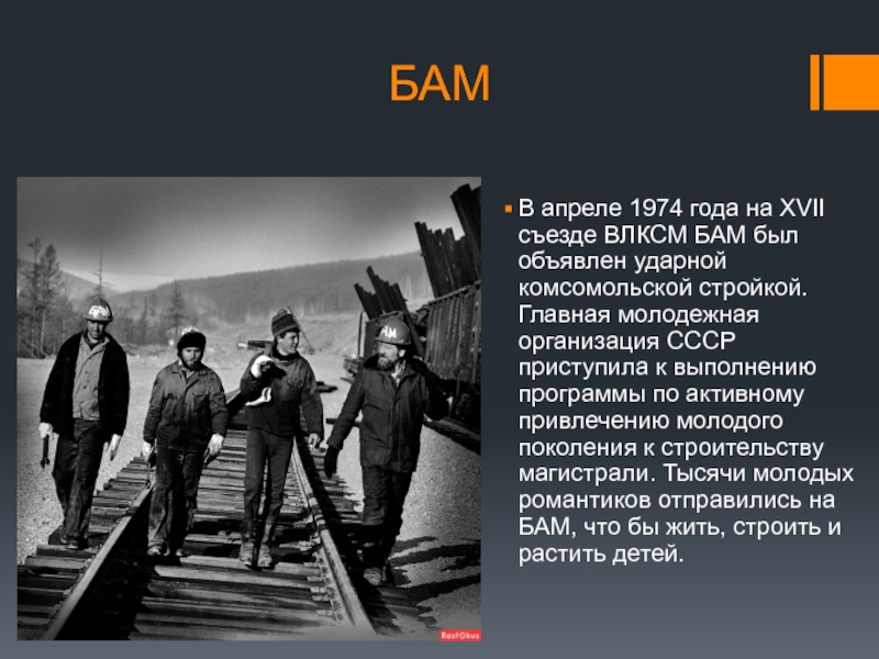ударной комсомольской стройкой. Главная молодежная организация СССР приступила к выполнению программы по активному привлечению молодого поколения к строительству магистрали. Тысячи молодых романтиков отправились на БАМ, что бы жить, строить и растить детей.