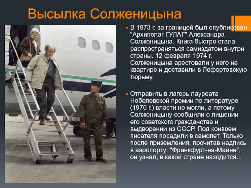 Отправить в лагерь лауреата Нобелевской премии по литературе (1970 г.) власти не могли, а потому Солженицыну сообщили о лишении его советского гражданства и выдворении из СССР. Под конвоем писателя посадили в самолет. Только после приземления, прочитав надпись в аэропорту: "Франкфурт-на-Майне", он узнал, в какой стране находится...