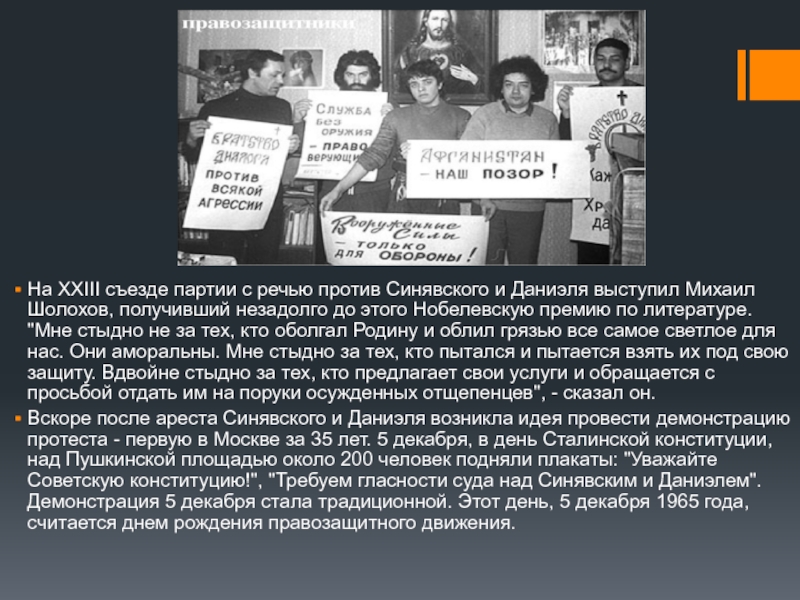 Вскоре после ареста Синявского и Даниэля возникла идея провести демонстрацию протеста - первую в Москве за 35 лет. 5 декабря, в день Сталинской конституции, над Пушкинской площадью около 200 человек подняли плакаты: "Уважайте Советскую конституцию!", "Требуем гласности суда над Синявским и Даниэлем". Демонстрация 5 декабря стала традиционной. Этот день, 5 декабря 1965 года, считается днем рождения правозащитного движения.