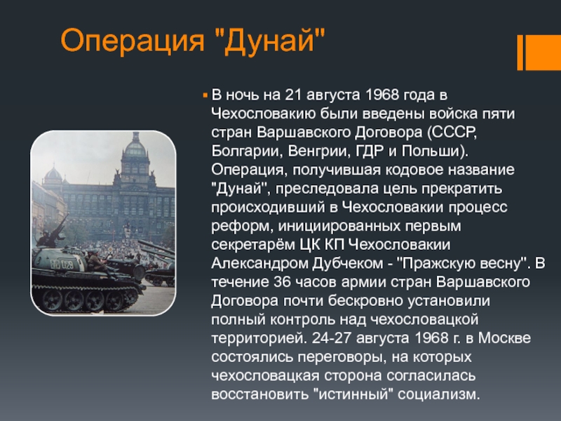 введены войска пяти стран Варшавского Договора (СССР, Болгарии, Венгрии, ГДР и Польши). Операция, получившая кодовое название "Дунай", преследовала цель прекратить происходивший в Чехословакии процесс реформ, инициированных первым секретарём ЦК КП Чехословакии Александром Дубчеком - "Пражскую весну". В течение 36 часов армии стран Варшавского Договора почти бескровно установили полный контроль над чехословацкой территорией. 24-27 августа 1968 г. в Москве состоялись переговоры, на которых чехословацкая сторона согласилась восстановить "истинный" социализм.