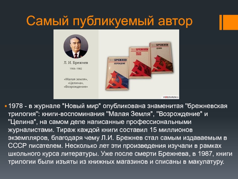 трилогия": книги-воспоминания "Малая Земля", "Возрождение" и "Целина", на самом деле написанные профессиональными журналистами. Тираж каждой книги составил 15 миллионов экземпляров, благодаря чему Л.И. Брежнев стал самым издаваемым в СССР писателем. Несколько лет эти произведения изучали в рамках школьного курса литературы. Уже после смерти Брежнева, в 1987, книги трилогии были изъяты из книжных магазинов и списаны в макулатуру.