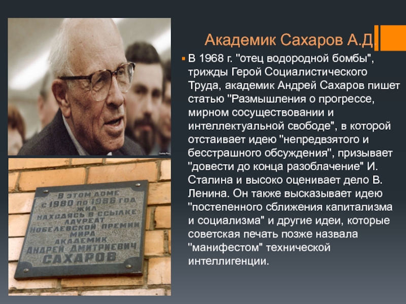 Труда, академик Андрей Сахаров пишет статью "Размышления о прогрессе, мирном сосуществовании и интеллектуальной свободе", в которой отстаивает идею "непредвзятого и бесстрашного обсуждения", призывает "довести до конца разоблачение" И.Сталина и высоко оценивает дело В.Ленина. Он также высказывает идею "постепенного сближения капитализма и социализма" и другие идеи, которые советская печать позже назвала "манифестом" технической интеллигенции.