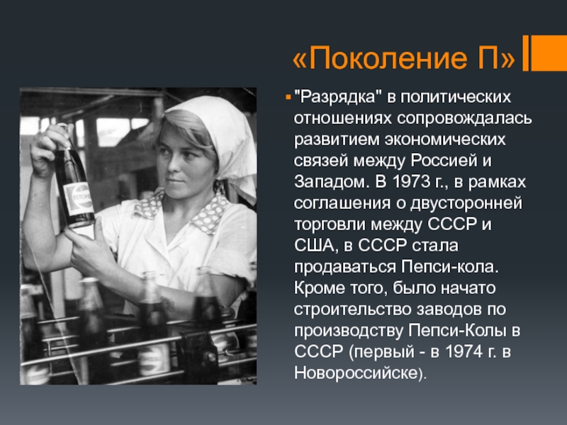 и Западом. В 1973 г., в рамках соглашения о двусторонней торговли между СССР и США, в СССР стала продаваться Пепси-кола. Кроме того, было начато строительство заводов по производству Пепси-Колы в СССР (первый - в 1974 г. в Новороссийске).