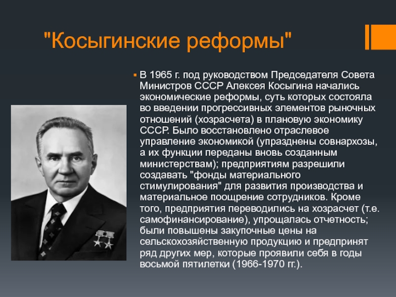 Косыгина начались экономические реформы, суть которых состояла во введении прогрессивных элементов рыночных отношений (хозрасчета) в плановую экономику СССР. Было восстановлено отраслевое управление экономикой (упразднены совнархозы, а их функции переданы вновь созданным министерствам); предприятиям разрешили создавать "фонды материального стимулирования" для развития производства и материальное поощрение сотрудников. Кроме того, предприятия переводились на хозрасчет (т.е. самофинансирование), упрощалась отчетность; были повышены закупочные цены на сельскохозяйственную продукцию и предпринят ряд других мер, которые проявили себя в годы восьмой пятилетки (1966-1970 гг.).