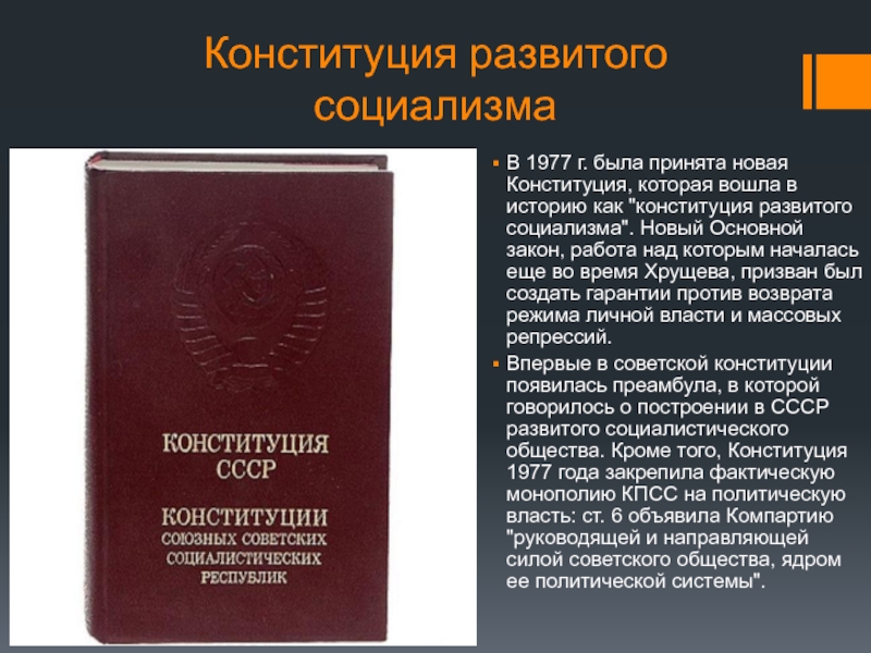 Впервые в советской конституции появилась преамбула, в которой говорилось о построении в СССР развитого социалистического общества. Кроме того, Конституция 1977 года закрепила фактическую монополию КПСС на политическую власть: ст. 6 объявила Компартию "руководящей и направляющей силой советского общества, ядром ее политической системы".