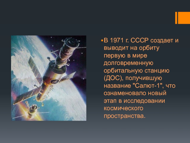Слайд 22В 1971 г. СССР создает и выводит на орбиту первую в