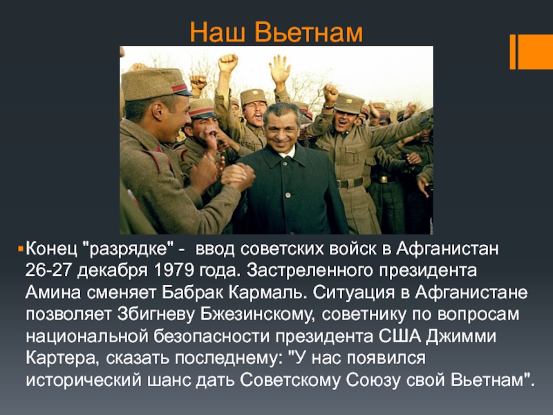 1979 года. Застреленного президента Амина сменяет Бабрак Кармаль. Ситуация в Афганистане позволяет Збигневу Бжезинскому, советнику по вопросам национальной безопасности президента США Джимми Картера, сказать последнему: "У нас появился исторический шанс дать Советскому Союзу свой Вьетнам".