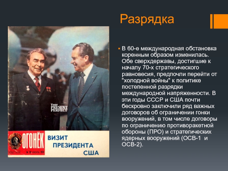 началу 70-х стратегического равновесия, предпочли перейти от "холодной войны" к политике постепенной разрядки международной напряженности. В эти годы СССР и США почти бескровно заключили ряд важных договоров об ограничении гонки вооружений, в том числе договоры по ограничению противоракетной обороны (ПРО) и стратегических ядерных вооружений (ОСВ-1 и ОСВ-2).