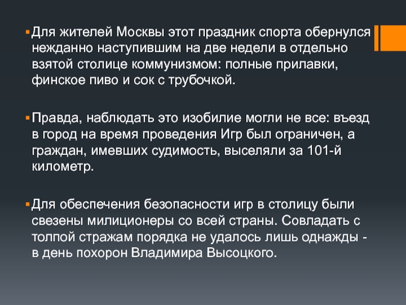 Правда, наблюдать это изобилие могли не все: въезд в город на время проведения Игр был ограничен, а граждан, имевших судимость, выселяли за 101-й километр.