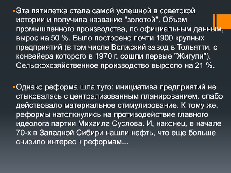 "золотой". Объем промышленного производства, по официальным данным, вырос на 50 %. Было построено почти 1900 крупных предприятий (в том числе Волжский завод в Тольятти, с конвейера которого в 1970 г. сошли первые "Жигули"). Сельскохозяйственное производство выросло на 21 %.