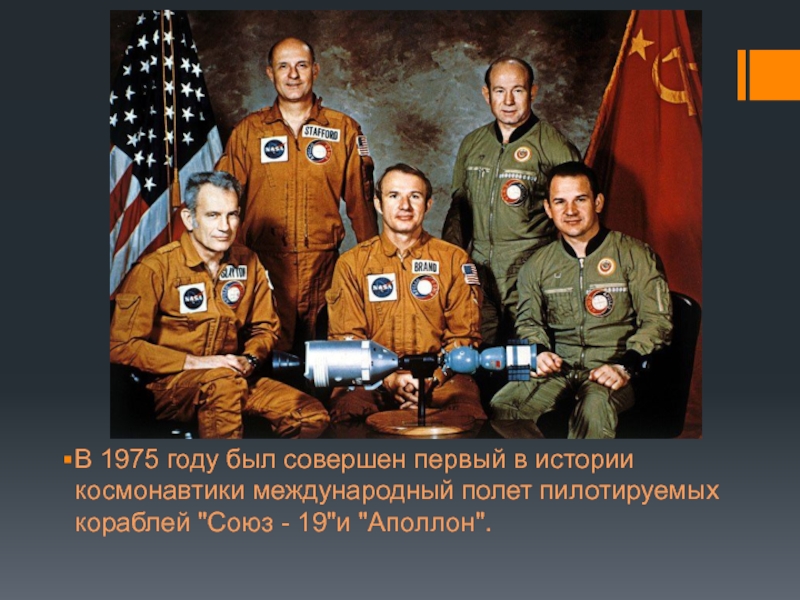 Слайд 23В 1975 году был совершен первый в истории космонавтики международный полет