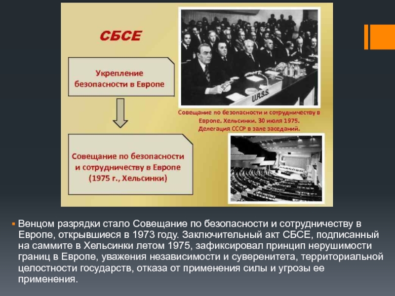 Слайд 6Венцом разрядки стало Совещание по безопасности и сотрудничеству в Европе, открывшиеся