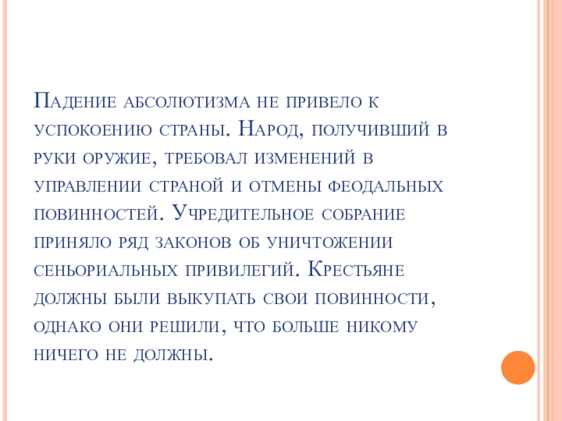 оружие, требовал изменений в управлении страной и отмены феодальных повинностей. Учредительное собрание приняло ряд законов об уничтожении сеньориальных привилегий. Крестьяне должны были выкупать свои повинности, однако они решили, что больше никому ничего не должны.