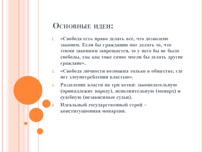 Разделение власти на три ветви: законодательную (принадлежит народу), исполнительную (монарх) и судебную (независимые судьи).