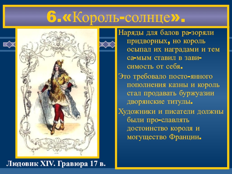 Наряды для балов ра-зоряли придворных, но король осыпал их наградами и тем са-мым ставил в зави-симость от себя.