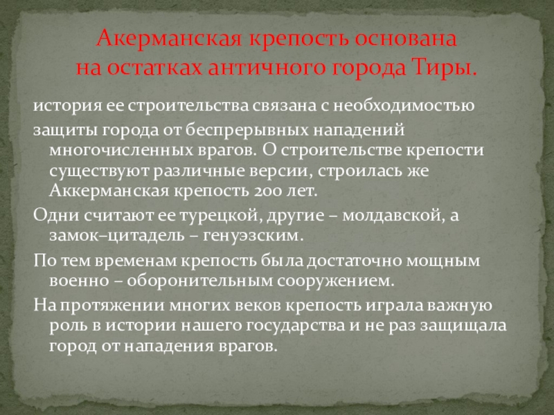 многочисленных врагов. О строительстве крепости существуют различные версии, строилась же Аккерманская крепость 200 лет.