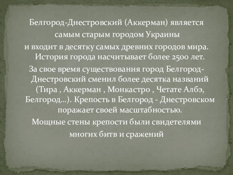 За свое время существования город Белгород-Днестровский сменил более десятка названий (Тира , Аккерман , Монкастро , Четате Албэ, Белгород…). Крепость в Белгород - Днестровском поражает своей масштабностью.