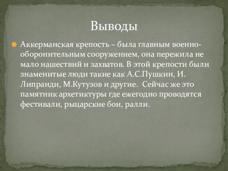 нашествий и захватов. В этой крепости были знаменитые люди такие как А.С.Пушкин, И.Липранди, М.Кутузов и другие. Сейчас же это памятник архетиктуры где ежегодно проводятся фестивали, рыцарские бои, ралли.