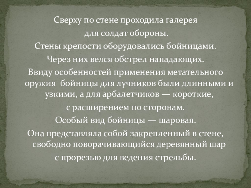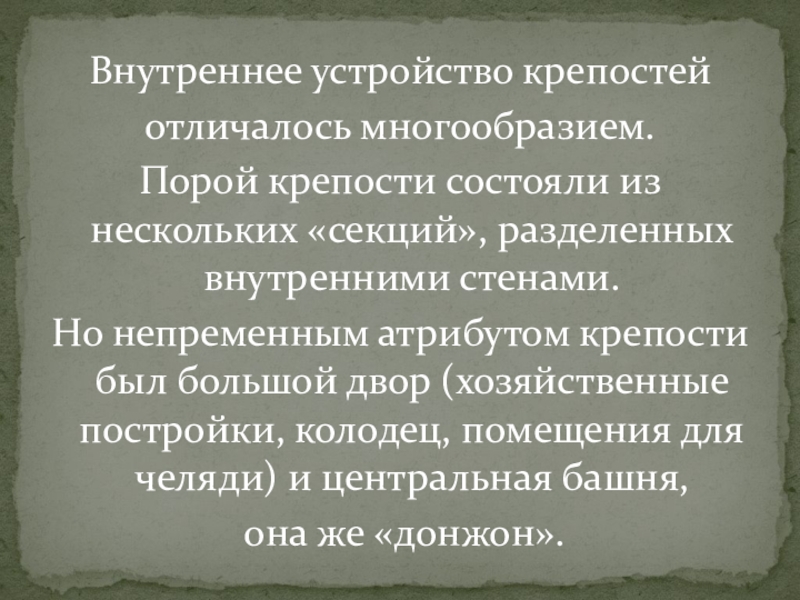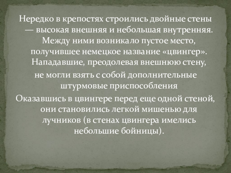 Слайд 14Нередко в крепостях строились двойные стены — высокая внешняя и небольшая