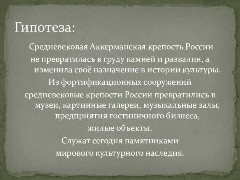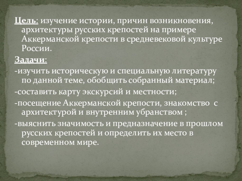 Слайд 4Цель: изучение истории, причин возникновения, архитектуры русских крепостей на примере Аккерманской