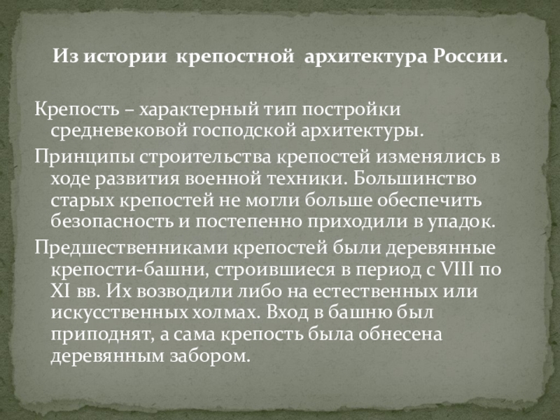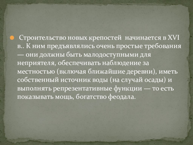 Слайд 13 Строительство новых крепостей начинается в XVI в.. К ним предъявлялись