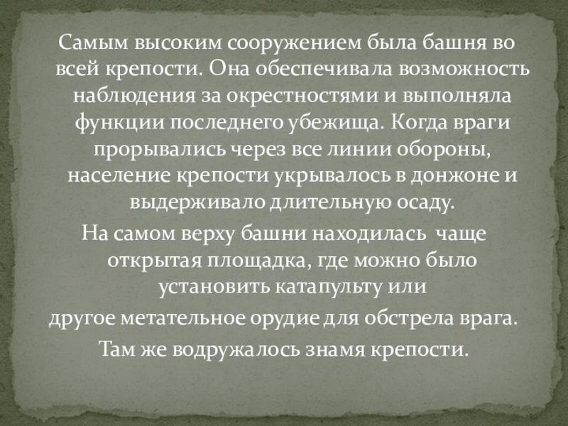 Слайд 18 Самым высоким сооружением была башня во всей крепости. Она обеспечивала