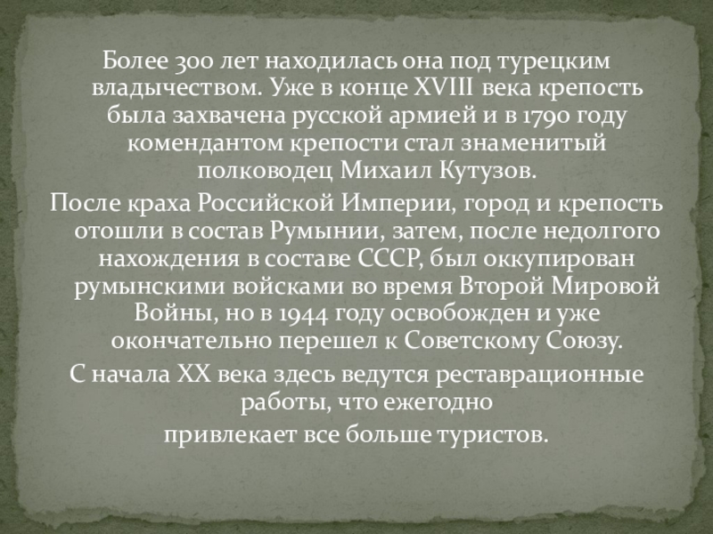 XVIII века крепость была захвачена русской армией и в 1790 году комендантом крепости стал знаменитый полководец Михаил Кутузов.
