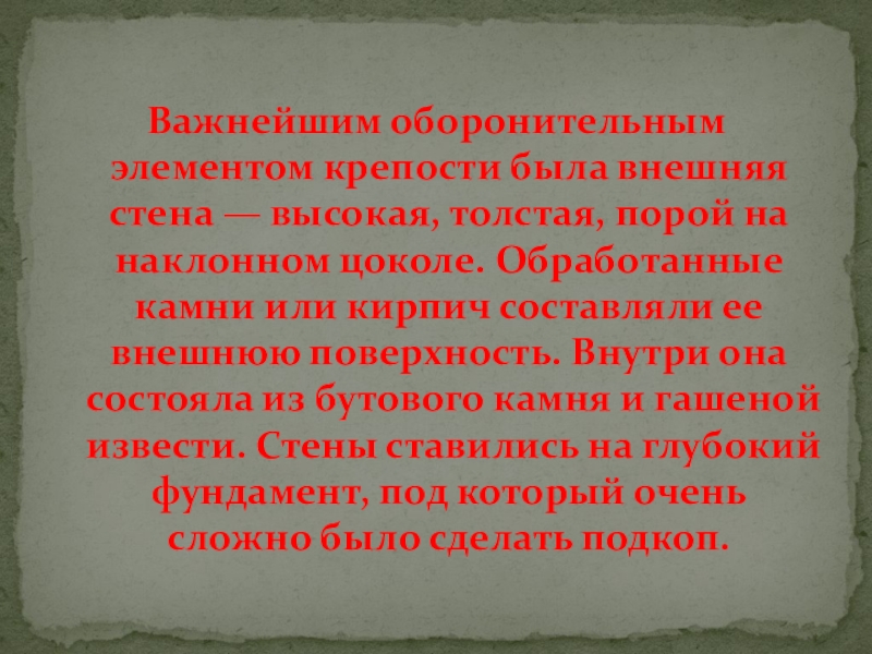 на наклонном цоколе. Обработанные камни или кирпич составляли ее внешнюю поверхность. Внутри она состояла из бутового камня и гашеной извести. Стены ставились на глубокий фундамент, под который очень сложно было сделать подкоп.