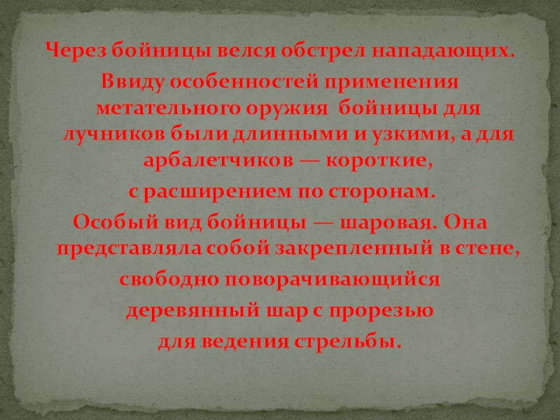 Ввиду особенностей применения метательного оружия бойницы для лучников были длинными и узкими, а для арбалетчиков — короткие,