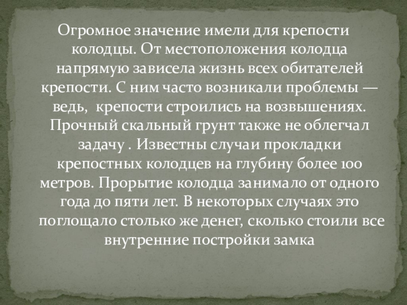 Слайд 17Огромное значение имели для крепости колодцы. От местоположения колодца напрямую зависела