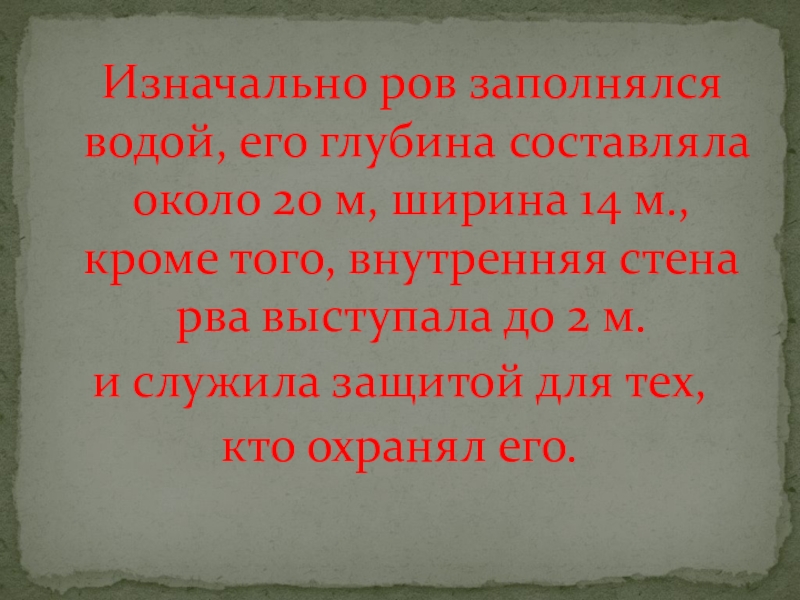 Слайд 31 Изначально ров заполнялся водой, его глубина составляла около 20 м,