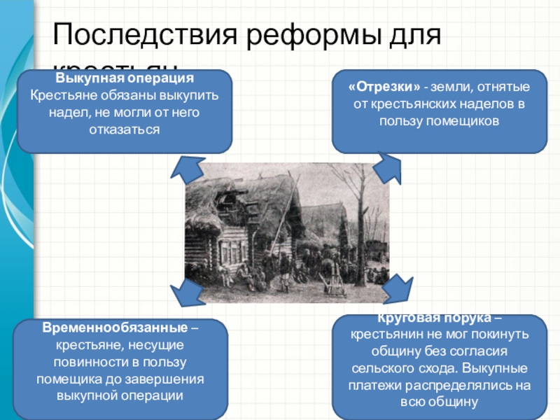 Круговая порука – крестьянин не мог покинуть общину без согласия сельского схода. Выкупные платежи распределялись на всю общину