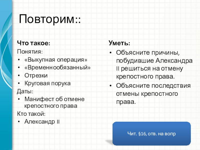 Объяснять причины, побудившие Александра II решиться на отмену крепостного права.
