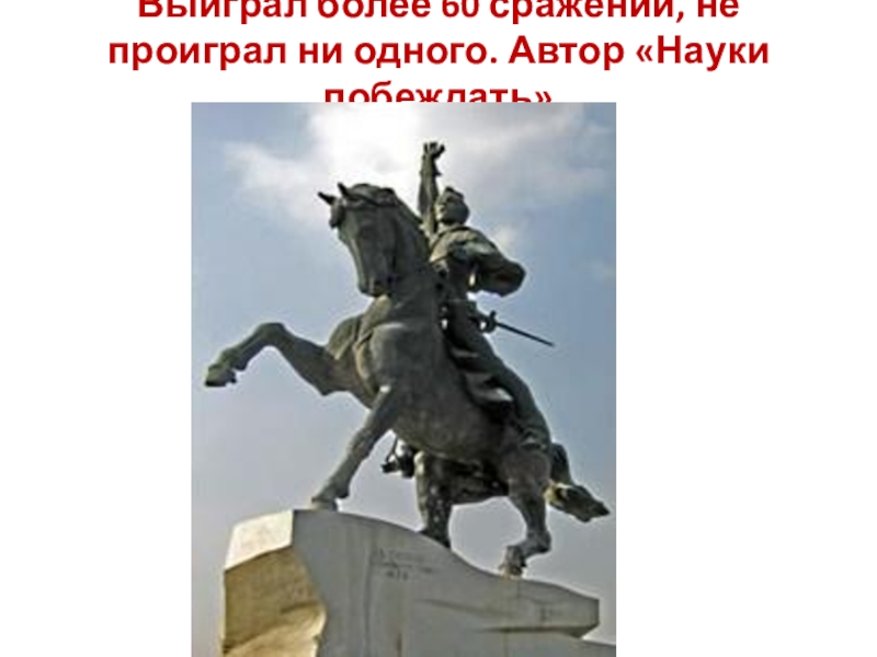 Слайд 8Выиграл более 60 сражений, не проиграл ни одного. Автор «Науки побеждать»