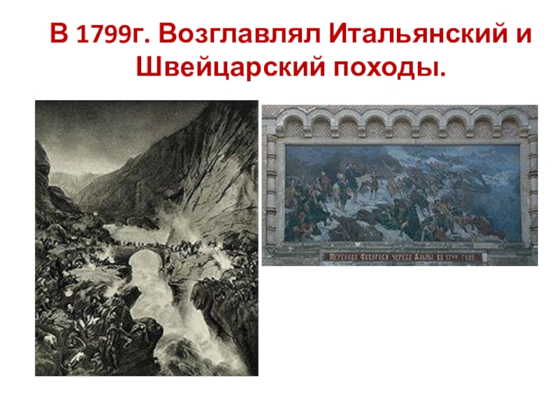 Слайд 7В 1799г. Возглавлял Итальянский и Швейцарский походы.